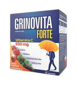 Grinovita Forte stanowi bogate źródło witaminy C (850 mg w 1 saszetce), zawiera cynk, wyciąg z owoców czarnego bzu, hibiskusa i naturalne koncentraty soków z czarnej porzeczki oraz sproszkowanych owoców maliny w saszetce.