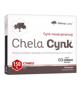 Olimp Chela-Cynk to prosty sposób na uzupełnienie diety w wysokiej jakości cynk. Każda z niewielkich kapsułek zawiera 15 mg cynku, który występuje w formie wysoko przyswajalnego chelatu aminokwasowego Albion™.