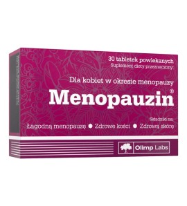 Olimp Menopauzin® to suplement diety polecany dla kobiet w okresie menopauzy. Preparat marki Olimp Labs zawiera kompozycję składników roślinnych – izoflawony sojowe oraz chmielu, łagodzące efekty towarzyszące menopauzie (np.: uderzenia gorąca, zwiększona drażliwość). Produkt dodatkowo wzbogacono o minerały (np.: wapń potrzebny do utrzymania zdrowych kości i zębów) i witaminy, które m.in. przyczyniają się do zmniejszenia zmęczenia (wit. B6), pomagają w zachowaniu zdrowej skóry i włosów (biotyna).