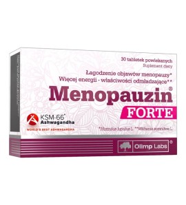 Olimp Menopauzin® Forte to suplement diety w formie tabletek powlekanych, zawierający kompozycję składników roślinnych – izoflawonów sojowych, ekstraktu szyszek chmielu oraz ekstraktu Ashwagandhy KSM-66® (Withania somnifera L.). Dodatkowo uzupełniony o wapń, witaminę D, E, B6 oraz kwas foliowy.