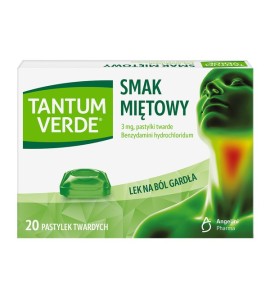 Tantum Verde smak miętowy to lek w formie pastylek do ssania. Benzydamina charakteryzuje się działaniem przeciwzapalnym i przeciwbólowym oraz działa miejscowo znieczulająco i odkażająco. Lek miejscowo dobrze się wchłania, osiągając duże stężenie w tkankach objętych procesem zapalnym. Lek jest na ogół dobrze tolerowany i nadaje się do miejscowego leczenia objawów zapalenia.