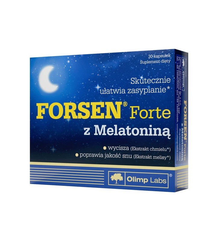 Olimp Forsen® Forte z Melatoniną! To wysokiej jakości preparat w formie łatwych do połknięcia kapsułek, którego formuła, co potwierdzają opinie, zawiera przemyślaną mieszankę ekstraktów roślinnych i melatoniny, wykazujących korzystny wpływ na proces zasypiania.