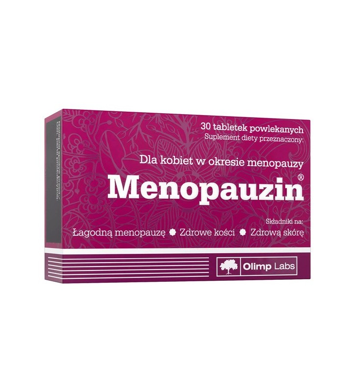 Olimp Menopauzin® to suplement diety polecany dla kobiet w okresie menopauzy. Preparat marki Olimp Labs zawiera kompozycję składników roślinnych – izoflawony sojowe oraz chmielu, łagodzące efekty towarzyszące menopauzie (np.: uderzenia gorąca, zwiększona drażliwość). Produkt dodatkowo wzbogacono o minerały (np.: wapń potrzebny do utrzymania zdrowych kości i zębów) i witaminy, które m.in. przyczyniają się do zmniejszenia zmęczenia (wit. B6), pomagają w zachowaniu zdrowej skóry i włosów (biotyna).