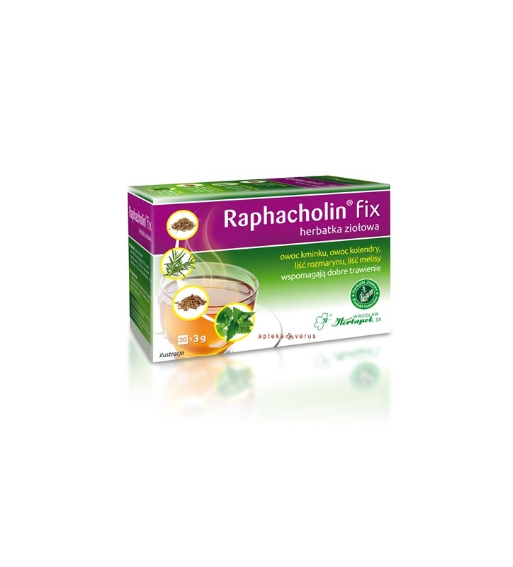 Raphacholin fix herbatka ziołowa 20 saszetek x 3 g Na dobre trawienie. Ziołowa herbatka skomponowana z myślą o osobach pragnących wspomóc swój układ trawienny. Zawarty w herbatce kminek wspomaga prawidłowa pracę jelit, rozmaryn wspiera trawienie tłuszczów i prawidłowe funkcjonowanie wątroby. Wspomożenie komfortu trawiennego poprzez korzystny wpływ na ilość gazów jelitowych zapewnia kolendra, a melisa wspiera proces prawidłowego trawienia.