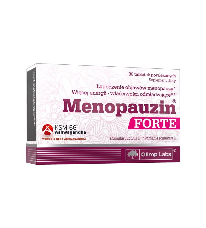 Olimp Menopauzin® Forte to suplement diety w formie tabletek powlekanych, zawierający kompozycję składników roślinnych – izoflawonów sojowych, ekstraktu szyszek chmielu oraz ekstraktu Ashwagandhy KSM-66® (Withania somnifera L.). Dodatkowo uzupełniony o wapń, witaminę D, E, B6 oraz kwas foliowy.