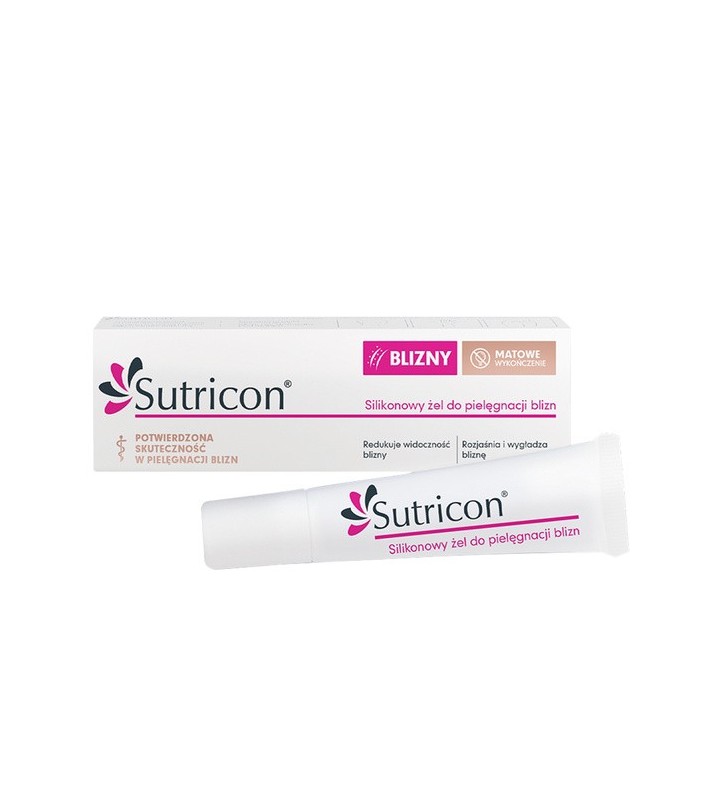 Regularne stosowanie żelu silikonowego Sutricon® poprawia wygląd blizny, zmniejsza ją i rozjaśnia. Żel szybko wysycha, tworząc na powierzchni skóry elastyczną, niewidoczną powłokę utrzymującą odpowiedni stopień nawilżenia skóry i chroniącą bliznę przed czynnikami zewnętrznymi. Może być stosowany w celu wspomagania leczenia blizn przerostowych i keloidów. Łagodzi objawy związane z posiadaniem blizny takie jak świąd czy uczucie ciągnięcia.