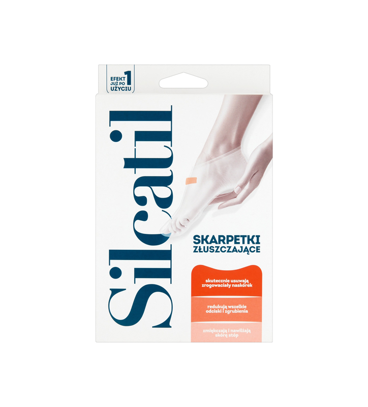 Silcatil to skarpetki złuszczające, które skutecznie usuwają zrogowaciały naskórek. Nadają się do redukowania odcisków i zgrubień, a także zmiękczają i nawilżają skórę stóp. Odpowiedni są dla stóp do rozmiaru 44.