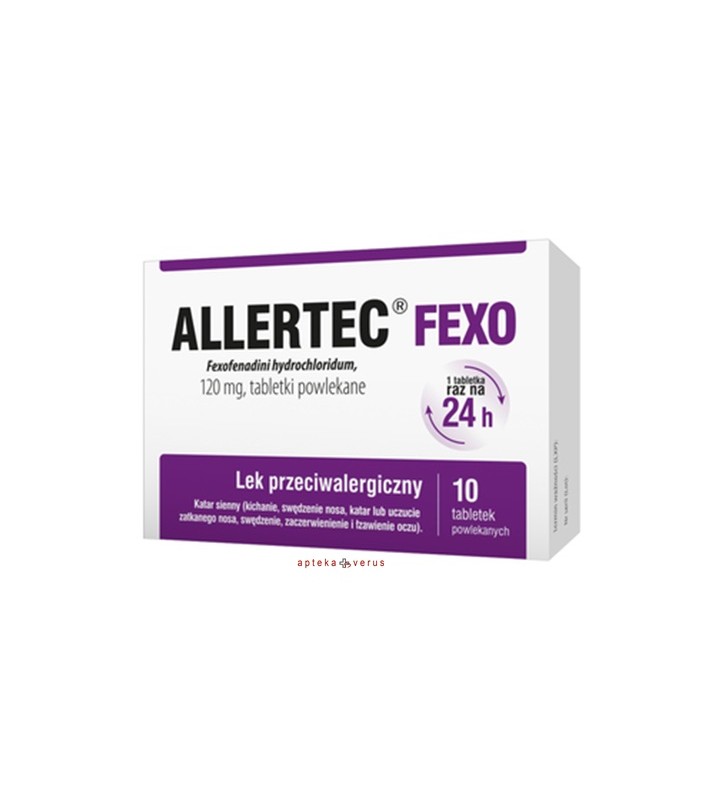 Allertec Fexo zawiera feksofenadyny chlorowodorek, który jest lekiem przeciwhistaminowym. Lek stosowany jest u dorosłych oraz u dzieci w wieku 12 lat i starszych w leczeniu objawów kataru siennego (sezonowego alergicznego zapalenia błony śluzowej nosa), takich jak: kichanie, swędzenie nosa, katar lub uczucie zatkanego nosa oraz swędzenie, zaczerwienienie i łzawienie oczu.