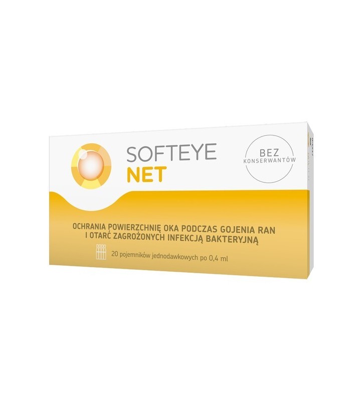 Softeye Net jest wskazany w leczeniu ran i otarć na powierzchni gałki ocznej, będących skutkiem urazu lub zabiegu chirurgicznego na oku. Stosowanie produktu Softeye Net jest zalecane osobom, które w ocenie lekarza są zagrożone wystąpieniem infekcji bakteryjnej.