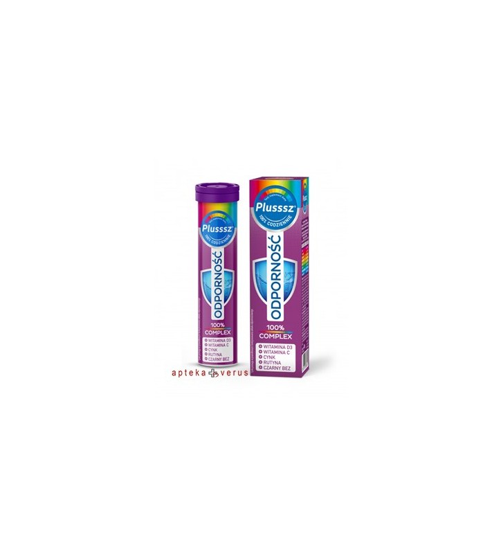 Plusssz Odporność 100% Complex to preparat stworzony z myślą o osobach dorosłych. Zawiera 100% immuno complex – specjalny zestaw składników wspierających odporność, m.in. cynk, selen, witaminę D3, C, B12, a także składniki pochodzenia naturalnego – czarny bez i rutynę.