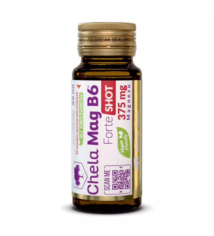 Olimp Chela-Mag B6® Forte Shot - suplement diety w płynie w ampułce. Zawiera substancje słodzące. Produkt zawiera wysoko przyswajalną formę magnezu w postaci chelatu aminokwasowego oraz witaminę B6.