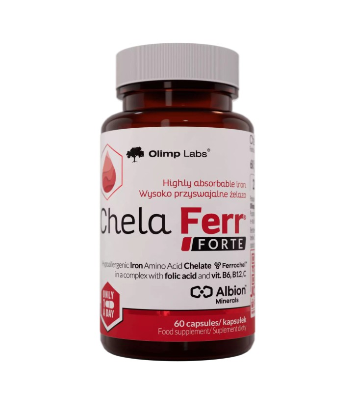 Olimp Chela-Ferr® Forte to suplement diety zawierający żelazo Ferrochel™ w formie wysoko przyswajalnego, hipoalergicznego łagodnego dla przewodu pokarmowego chelatu aminokwasowego Albion. Uzupełniony został o kwas foliowy i witaminy: C, B6, B12.