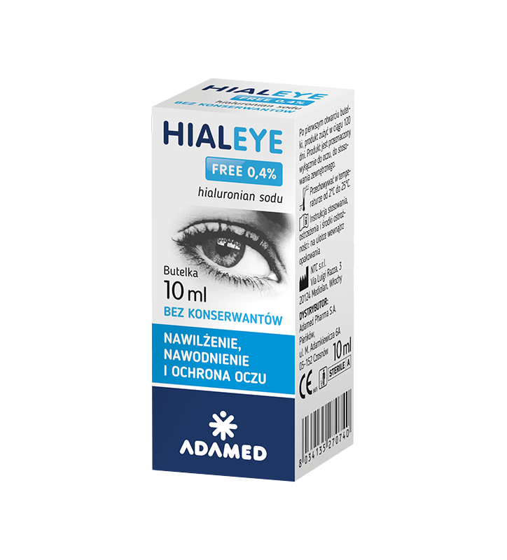 Hialeye Free 0,4% bez konserwantów to roztwór do oczu o stężeniu 0,4% zawierający hialuronian sodu o dużej masie cząsteczkowej, uzyskiwany metodą syntezy biotechnologicznej. Hialuronian sodu ma właściwości mukomimetyczne, mukoadhezyjne i wiskoelastyczne, dzięki czemu poprawia stabilność filmu łzowego i utrzymuje komfort powierzchniowych struktur gałki ocznej poprzez ich nawilżenie, nawodnienie i ochronę. Dzięki swoim właściwościom nawilżającym i ochronnym hialuronianu sodu łagodzi podrażnienia, suchość, pieczenie i uczucie obecności ciała obcego w oku wywołane czynnikami środowiskowymi takimi ja wiatr, słońce, suche powietrze, słona woda, dym, nadmierne oświetlenie, klimatyzacja, ogrzewanie, długotrwałe korzystanie z komputera, częste i długotrwałe stosowanie soczewek kontaktowych.
