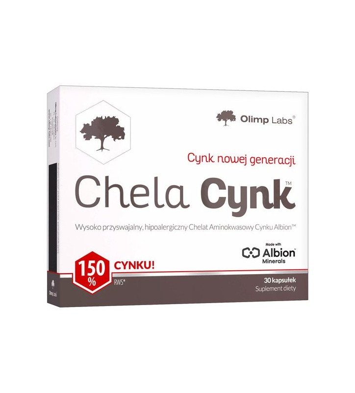 Olimp Chela-Cynk to prosty sposób na uzupełnienie diety w wysokiej jakości cynk. Każda z niewielkich kapsułek zawiera 15 mg cynku, który występuje w formie wysoko przyswajalnego chelatu aminokwasowego Albion™.
